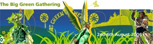 Big Green Gathering 2-6 August 2006 Fernhill Farm, Nr Cheddar, Somerset, England. The Big Green Gathering is a 5 day family camping event in the beautiful Mendip Hills demonstrating greener lifestyles, music and healthier natural living. It's been running since 1994 and is now one of the biggest Green Gatherings in Europe. It has grown out of the original Green Gatherings of the 1980's and the Green Fields of Glastonbury Music Festival. It has developed organically in response to a desire from people within the green movement for a festival that was focused on Green issues. Now we have somewhere between 15,000 and 20,000 people expected this year. Staying Green is now a bigger challenge than ever. The Big Green Gathering Co. Ltd. was established in 1994 - click here to read more about the history. The Big Green Gathering is for people who care about health, the environment, sustainability, our children's future and life in general. It is a celebration of our natural world and our place within it. As such it is a place for enjoyment, learning and fun. Unhealthy activities are not encouraged. The only things taken in excess should be love, peace, joy, and friendship. The Big Green Gathering Co Ltd is a not-for-profit democratic company, whose shareholders have one share and one vote each. Tickets are for the full 5 days and start at £60 concessions for students. To order tickets telephone 01458 830281. For more information to the www.big-green-gatherine.com click here >> |