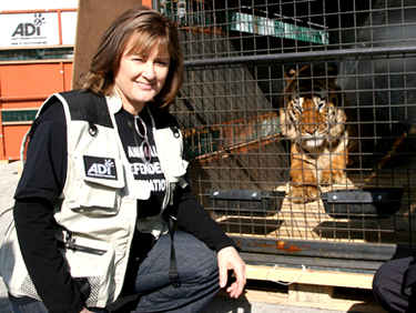 -Steps to Freedom- We all want to see animals content in the wild, safe in their natural habitat, and that feeling you get when your stomach turns as you feel helpless to stopping the cruelty is what stirs us all on to try and make a change. Chief Executive of ADI and NAVS, Jan Creamer, has dedicated over 25 years to making sure the public never forget the face of animal suffering. By personally carrying out undercover investigations, overseeing international rescue operations, and producing hard-hitting scientific reports, Jan has been on the frontline for animals. A decade ago it was an ADI undercover investigation led by Jan that shook the UK circus industry to its foundations and saw Mary Chipperfield, who was found guilty of 13 cases of cruelty to baby chimp Trudy. It is always difficult for anyone to witness animal cruelty first hand, so while these rescue stories have a happy ending, there is always a difficult road to travel. En route to those first steps to freedom, Jan and her team face the suffering of animals, the nerve wracking process of gathering vital evidence, the battles with officialdom to secure the seizure of animals and then permits to move them – even going toe to toe with local gangsters trying to seize animals for themselves! But it melts away when these beautiful animals take their first steps to freedom, or embrace their own kind at last, after years in isolation. “Our loveable rogue Tarzan, a tiger who was rescued from a dilapidated circus in Portugal, now basks in the sun and often lays happily in his pool at the ADI Rescue Centre in South African.” says Jan. “He is so different now to when we first found him in a tiny, filthy cage on the back of a lorry. Tigers are such majestic and powerful animals, it is devastating to see them stripped of their dignity and barely able to move at the circus.”