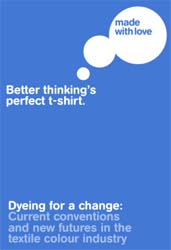 It's been a long time in the making, but it’s nearly ready... 'Dyeing for a change: Current conventions and new futures in the textile colour industry', better thinking's report on the impacts of textile dyeing, will be available to download from our blog as of next week. Drop us a line at perfect@betterthinking.co.uk if you want us to tell you when it’s up there. The Report’s part of our self-initiated challenge to create the world's most socially positive and environmentally responsible t-shirt, and typical of our approach to find out as much as we can about all of the options available to us so we can be sure that every decision has been properly considered. The report simplifies and summarises almost everything we read and found out about all the different ways to colour fabric. It’s been rather complicated: available information has either been thoroughly uninformative, or incredibly scientific (a favourite sentence of ours being ‘although D-fructose would appear to be non-reducing, the structure readily undergoes keto-enol tautomerism’). But we’ve put all the useful information into terms suitable for non-rocket scientists, highlighting as many issues relating to each method as we could. As always with eco-design, comparing apples with oranges makes it impossible to find a cut-and-dry solution, but at least we’re raising awareness about the impacts and viable alternatives and starting a dialogue with people about the issues.