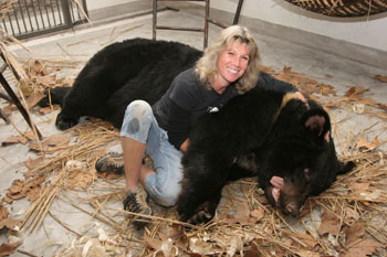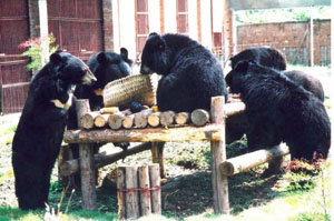Once recovered from their injuries bears move from the quarantine block to the bamboo-forested area, before this most had never walked on grass, felt the sun or rain. Here they have the option of snuggling down in their dens, furnished with ‘hanging basket’ beds and stimulating toys or roaming and playing with the other bears. This is rarely observed in the wild, as Moon Bears are solitary creatures. This is just one of the surprises of working with the Moon Bears; the others include their intelligence, gentleness, sense of fund and immensely forgiving natures. Some of our bears need extra special care such as blind Snoopy who arrived thrashing her head against the bars of her crush cage, blood oozing from her open wounds. Snoopy joined frail little Franzi and brain damaged Rupert in the special care bear section of the sanctuary known as the ‘secret garden’. Franzi, now in her late 80s in human terms, weighs only 50 pounds compared to most bears weighing in at 260 pounds. She is stunted from living in the same tiny cage since she was a cub. "Deliberately de-clawed, de-toothed and a horrible pus-infected wound in her abdomen showed all too clearly her life of being milked like a machine. More than anything, her eyes said it all - and every so often she'd look up from staring at the floor, look sadly and intensely into our eyes for a few seconds before turning back to the corner to the cage, retreating into her world of pain and despair." Jill remarked soon after Franzi was first rescued. Franzi also shares the secret garden with her best pal Rupert – really a ‘bear with very little brain’ as he was permanently brain damaged from an infection caused by the bear milking process.