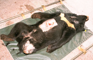 After her discovery, Jill embarked on a long process of negotiations with the Chinese government. In 1995, she secured the release of the original bears she had discovered in 1993 and 5 years later founded the Animals Asia Foundation (AAF). Today there are some 7000 bears on farms across China; many of these bears are imprisoned in coffin-likes cages for over twenty years before suffering an agonizingly slow death due to infection and tumours. It’s a cliché but ‘words really cannot describe’ the pain, injuries, physical and mental suffering endured by these intelligent and gentle creatures. Some bears have grown in to the metal bars, others have been deliberately declawed and detoothed, many have open head wounds caused by banging their heads against the cage bars in a desperate attempt to stimulate their intelligent minds and somehow ease their suffering. Some, like handsome Jasper, are doomed to lie their entire lives flat on the floor of their ‘crush’ cages, squeezed down by a devise containing them during milking and where the farmer cannot be bothered to lift up the crush bar again.